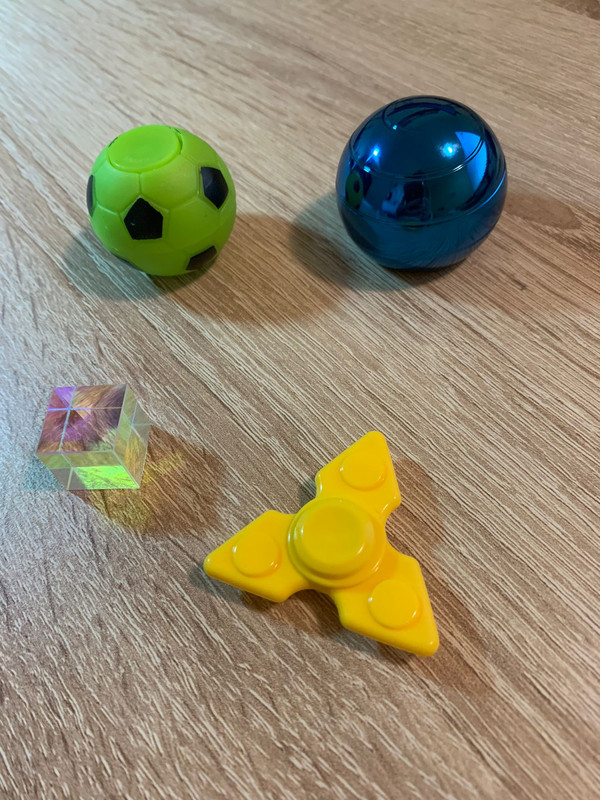j'ai un mini handspiner, une boule "éternelle", un petit prisme, un mini ballon de foot anti-stress